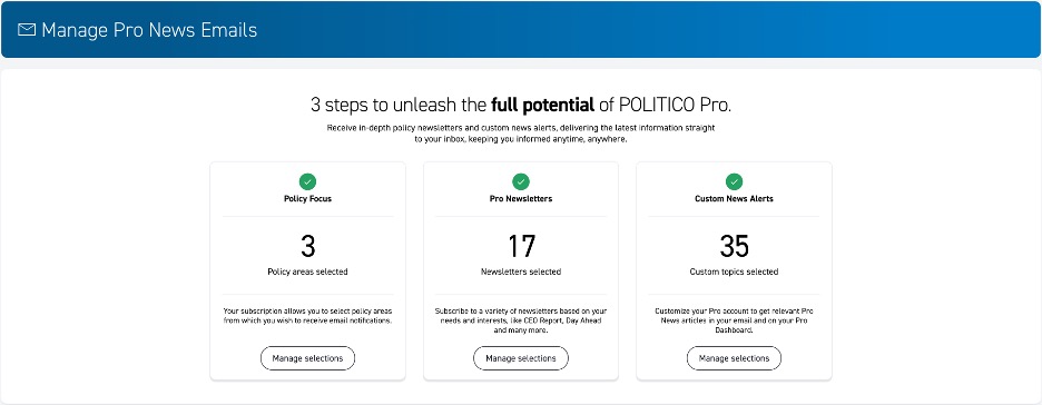 As a Pro account holder, you have a number of Policy Areas based on the subscription plan you’ve chosen. A Policy Area activates the content that will be delivered to your inbox. Pro Tip: Your POLITICO Pro account comes with all-inclusive access to all 22 Policy Areas through the Pro platform. Simply put, this means you can read all the Pro news articles when logged on to the Pro platform.